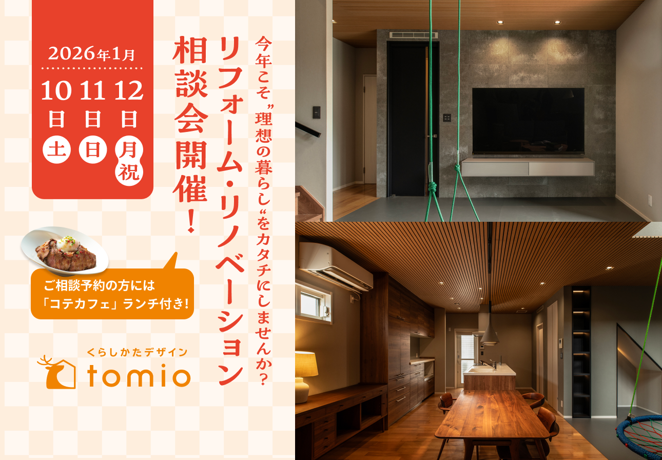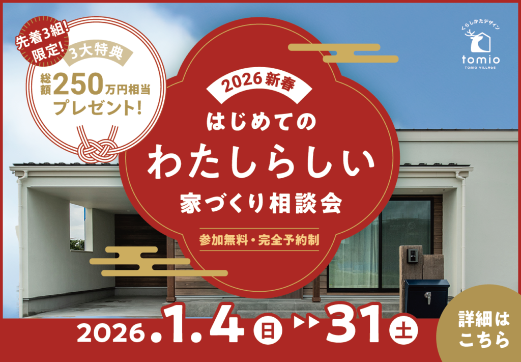 2026年のはじまりに、わたしたちトミオから皆さまへお届けするスペシャルイベントが決定いたしました!家づくりを考え始めた方にも、今まさに具体的な一歩を踏み出そうとしている方にもぴったりの、完全予約制の個別相談会です。